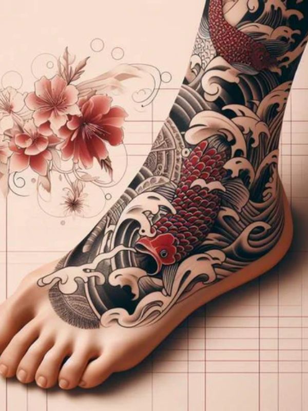 Design dynamics show koi appearing to swim around feet naturally. Curved bodies wrap around ankles following circular movements gracefully. Swimming across foot tops creates horizontal movement and flow. Paired koi represent yin-yang balance and complementary energies. Water elements like waves enhance koi’s natural aquatic environment.