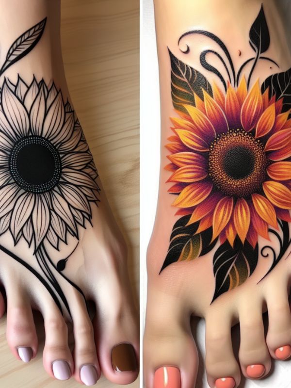 Design styles range from photorealistic to whimsically illustrated interpretations. Realistic rendering captures every seed’s texture within flower faces. Illustrative approaches emphasize graphic beauty over botanical accuracy perfectly. Minimalist outlines suggest sunflowers through essential lines only. Watercolor techniques splash yellow joy across your foot artistically.